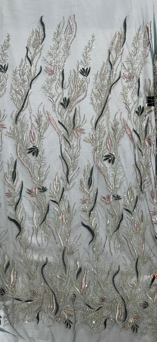 This Blush Floral Confetti Beaded Mesh Lace sparkles with playful elegance. Metallic threads woven through the mesh base accentuate the soft blush tone. At the same time, hand-applied satin petals, sequins, and miniature floral motifs create a scattered “confetti” effect that shimmers beautifully with movement.